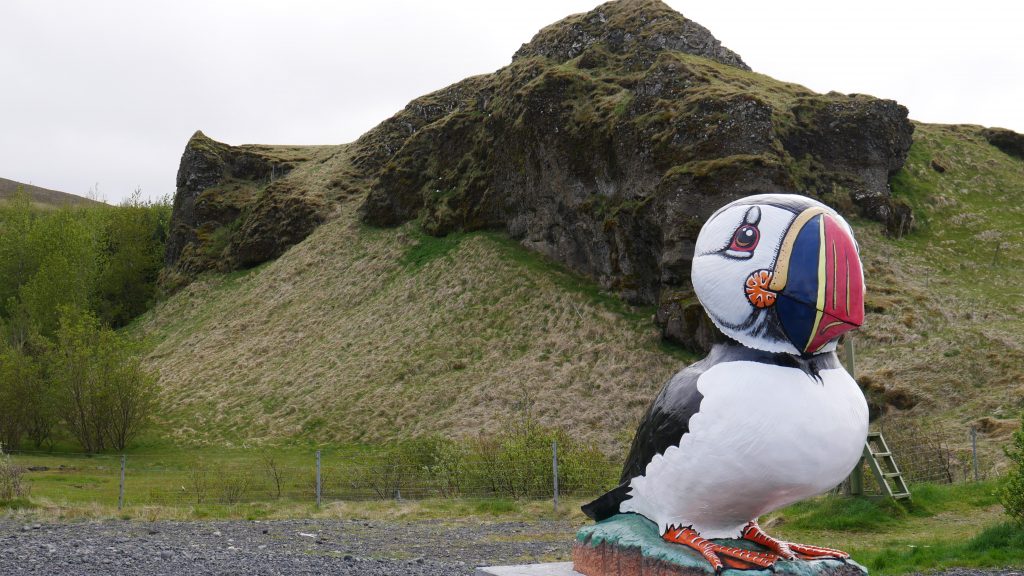 Die Straßen und Brücken sind hier abenteuerlich, aber die Tierwelt hat es in sich. Die gutmütigen Islandpferde kommen direkt an die Straße, um uns zu begrüßen. Für Hobby-Ornitologen gibt es richtig was zu sehen: Austernfischer, Goldregenpfeiffer und viele viele Möven bzw. Tölpel saßen am Wegesrand auf den Zaunspfählen. Wer jetzt wissen will wie die aussehen kann hier nachschauen. Die größte Attraktion für Vogelliebhaber sind natürlich die Puffins. Einer stand direkt am Touri-Parkplatz – er war über 2m groß und wirkte etwas leblos. Komische Vögel.