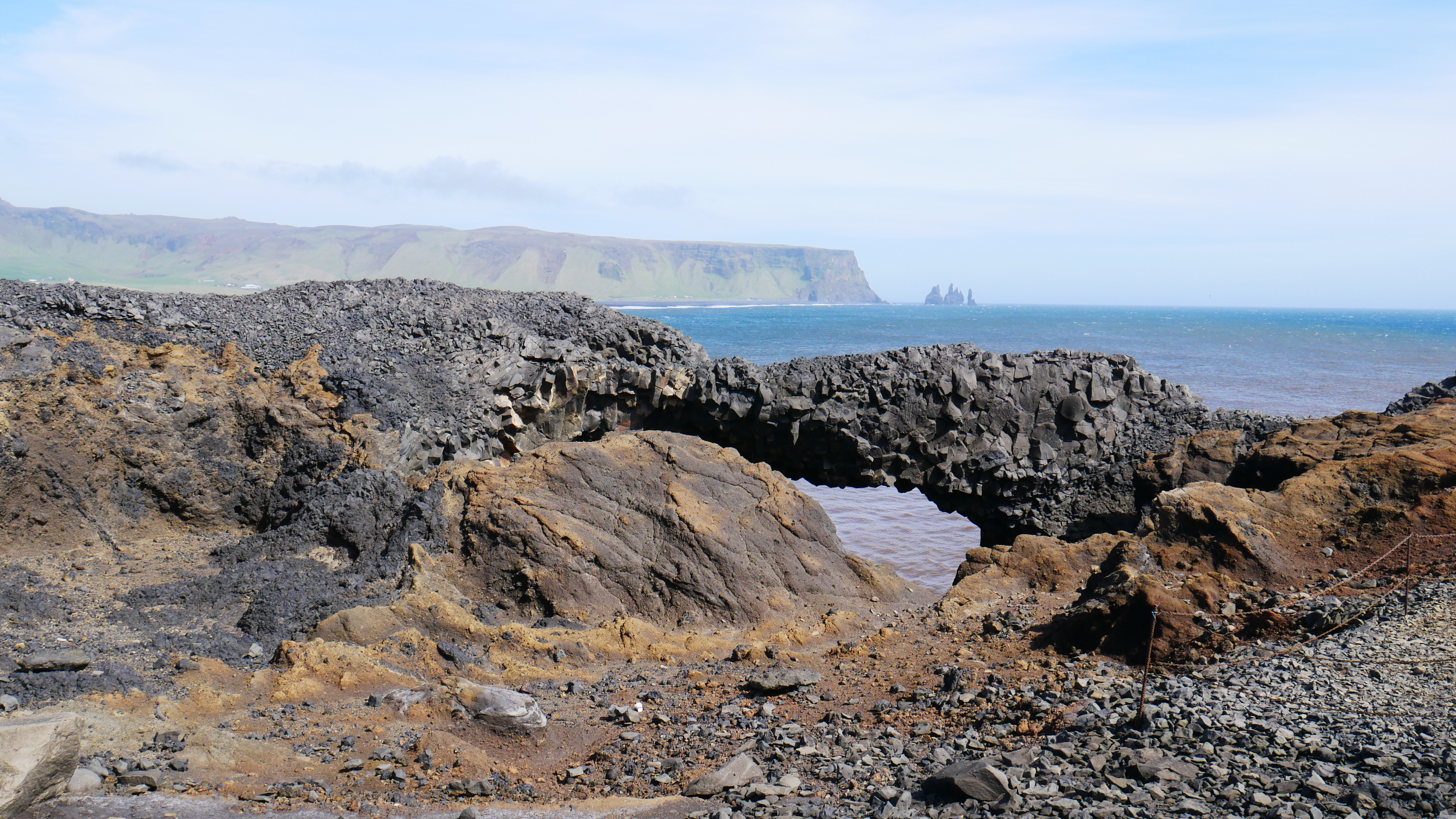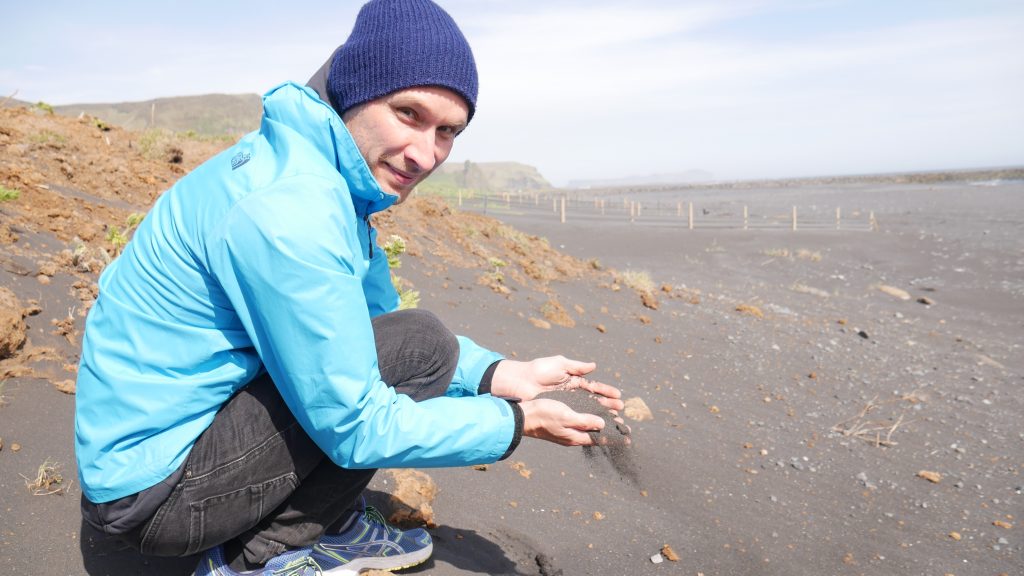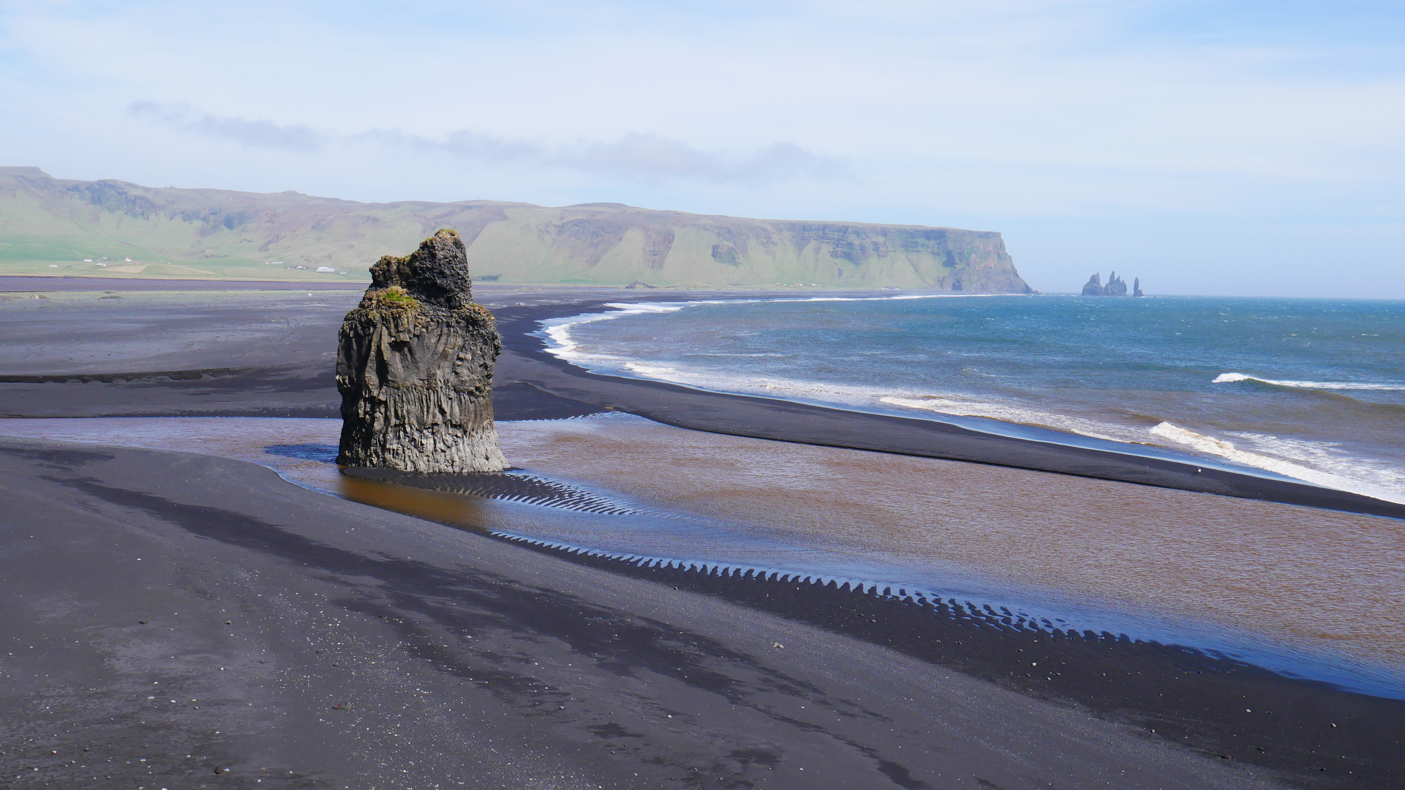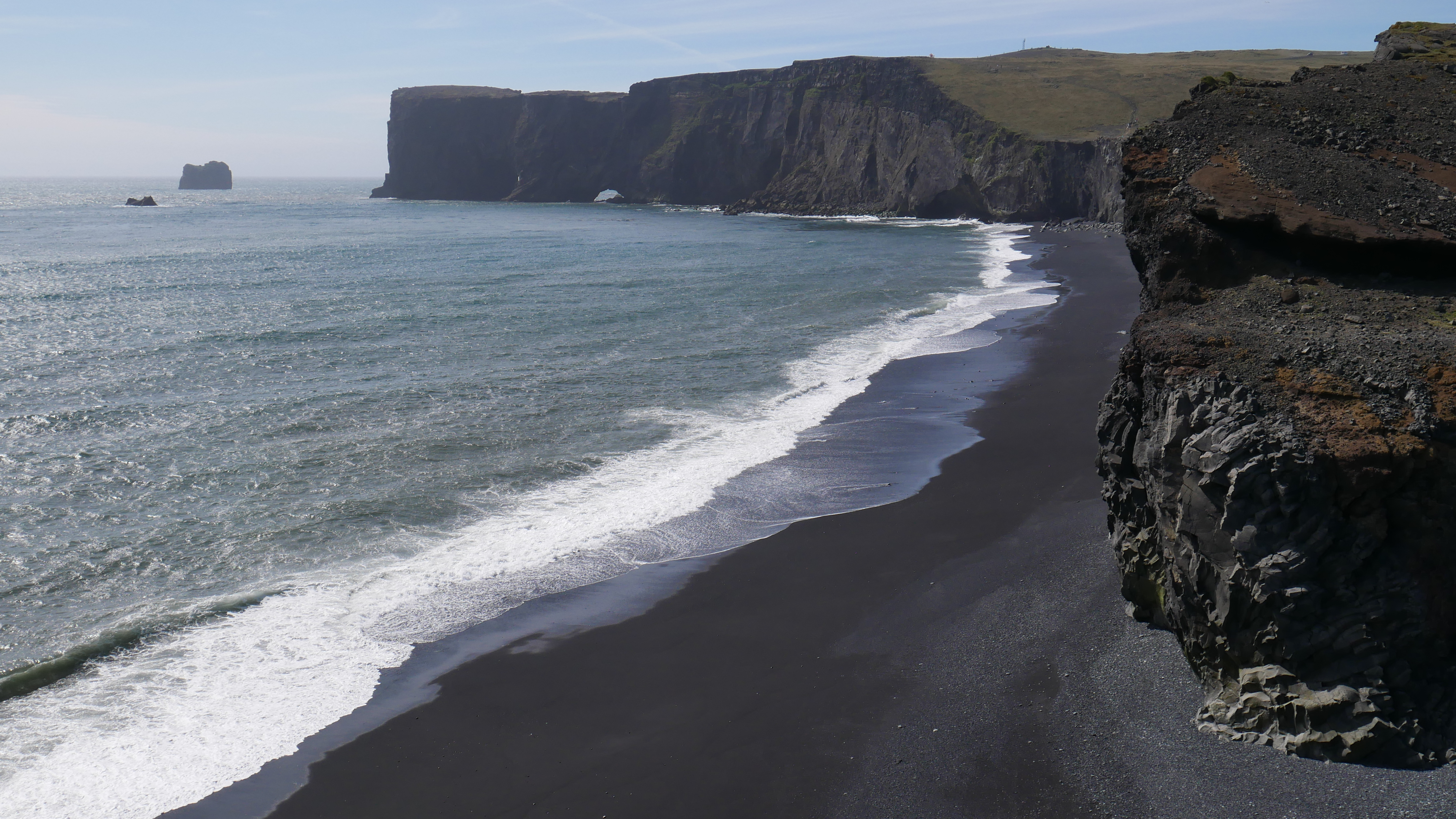 Weiter ging es an unendlichen Berghängen entlang der Ringstraße ostwärts. Das Meer sieht man hier jedoch selten, die Küste ist sehr weitläufig. Ein paar Kilometer weiter kurz vor Vik bekommt man dafür dann die volle Entschädigung. Schroffe Felsen, pechschwarzer Strand und schäumende Brandung – begleitet von einem Wind, der den Atem raubt. Man hat das Gefühl in einer anderen Welt zu sein. Den ersten Papageientaucher haben wir auch live gesehen, allerdings nur aus der Ferne und im kurzen Vorbeiflug. Vielleicht kommen wir im Laufe der Reise mal näher ran.