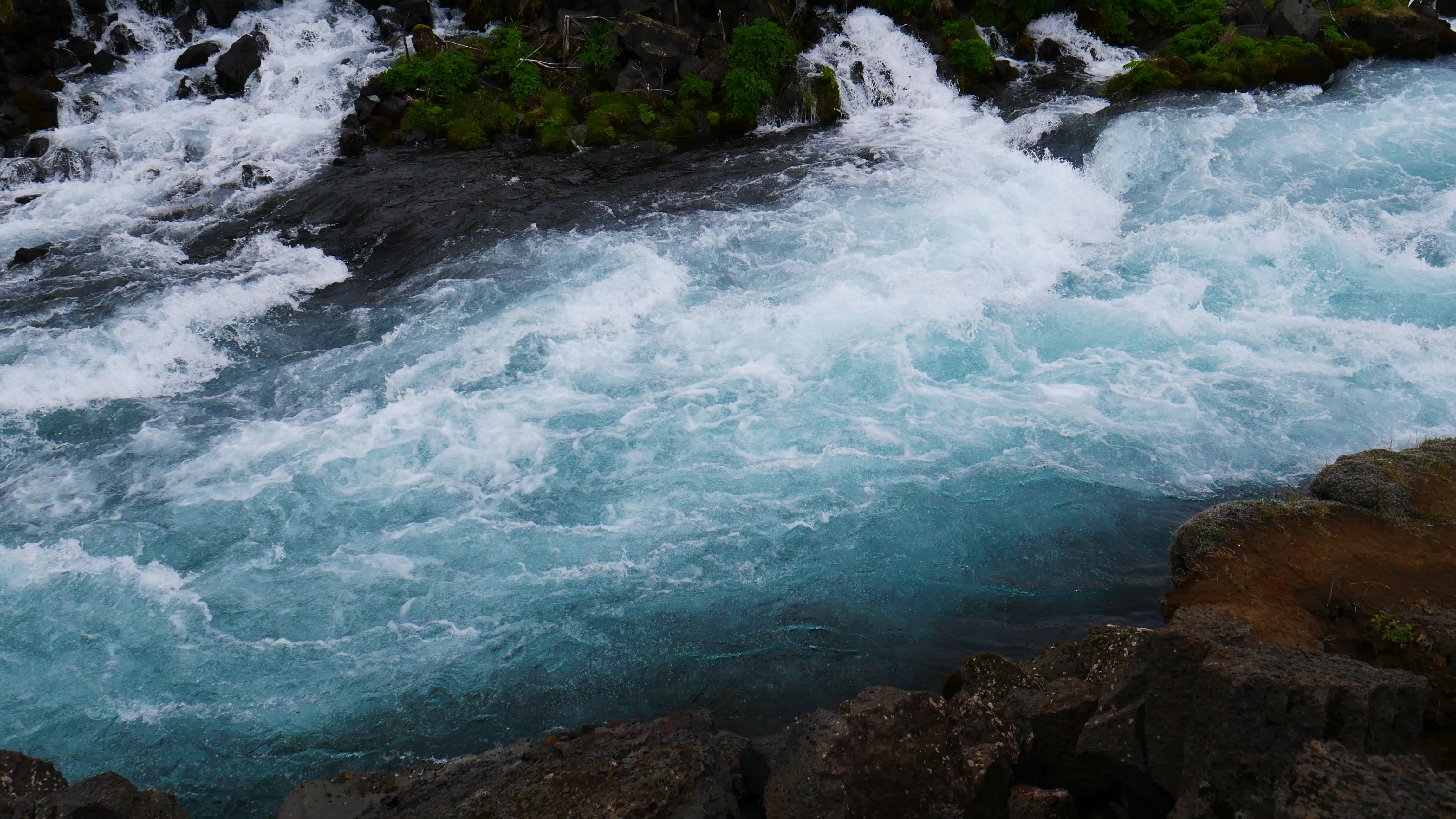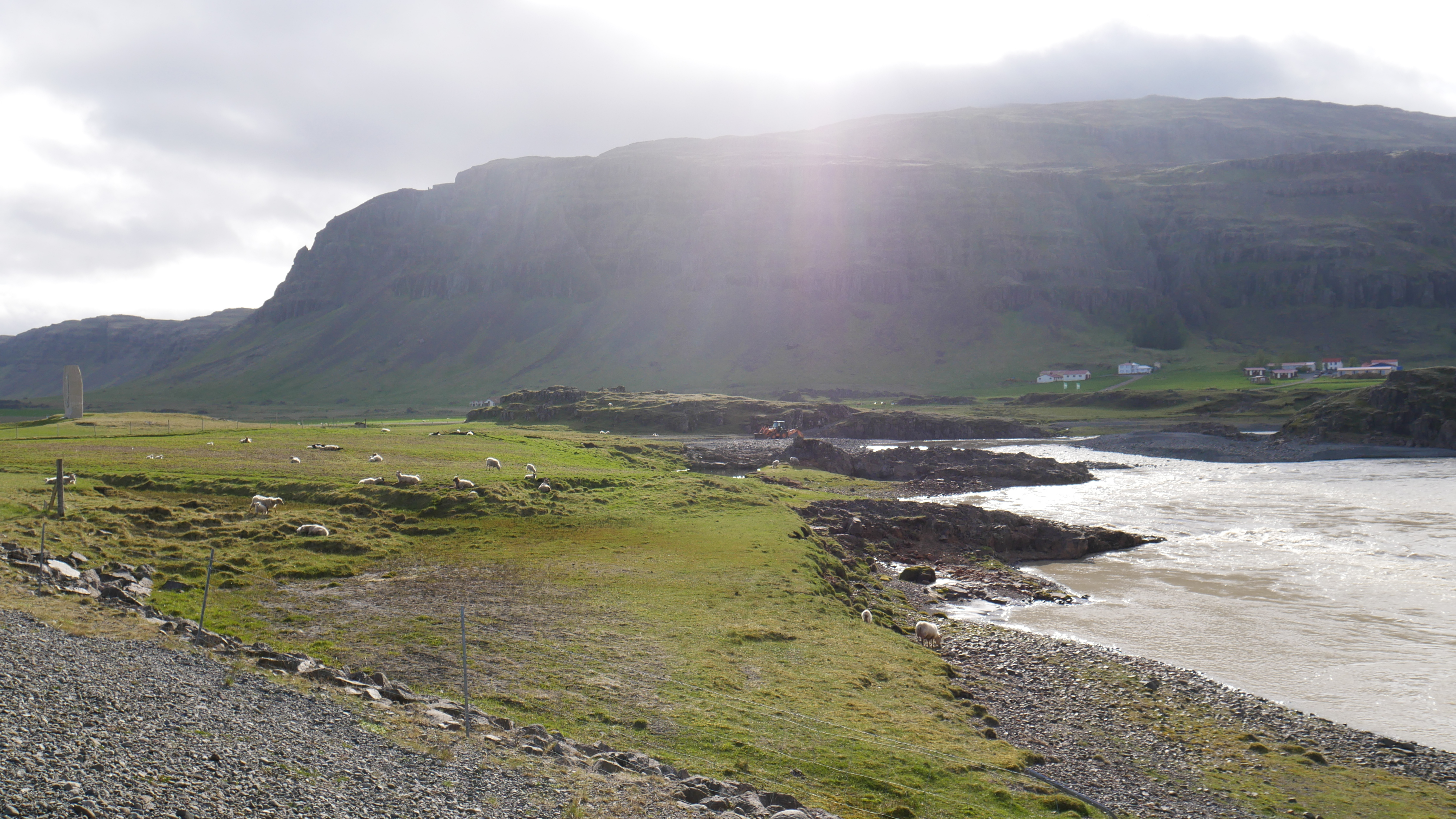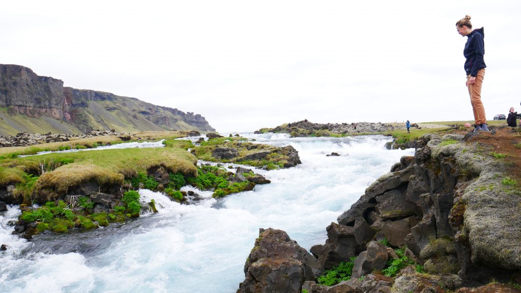 Bei Foss zeigten sich dann auch die ersten Vorboten der Gletscher, die wir heute besichtigen wollten, in Form eines reißenden Flusses direkt neben der Straße. Strahlend blaues Wasser zwischen grünen Wiesen, das ist Islands Süden.