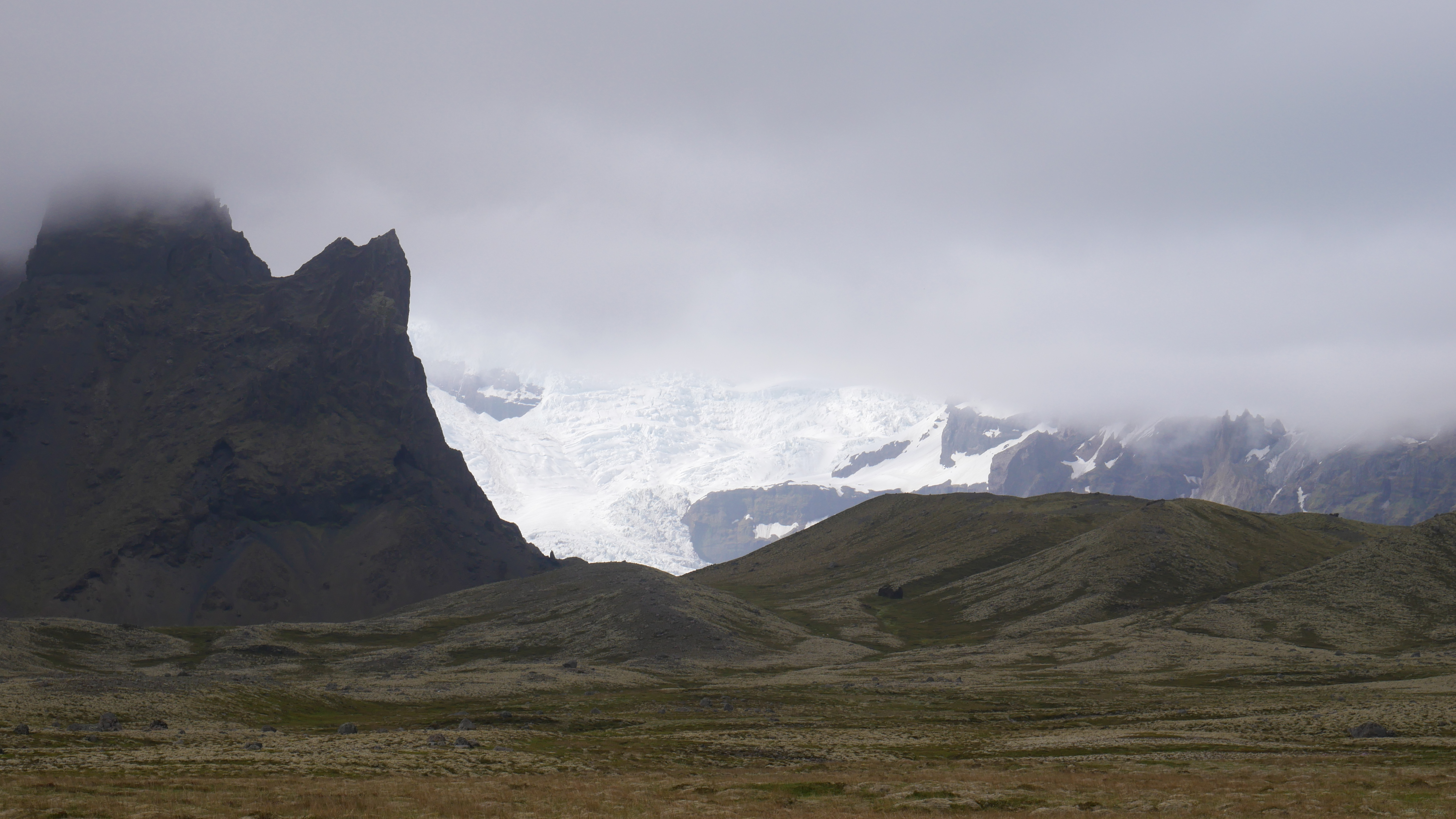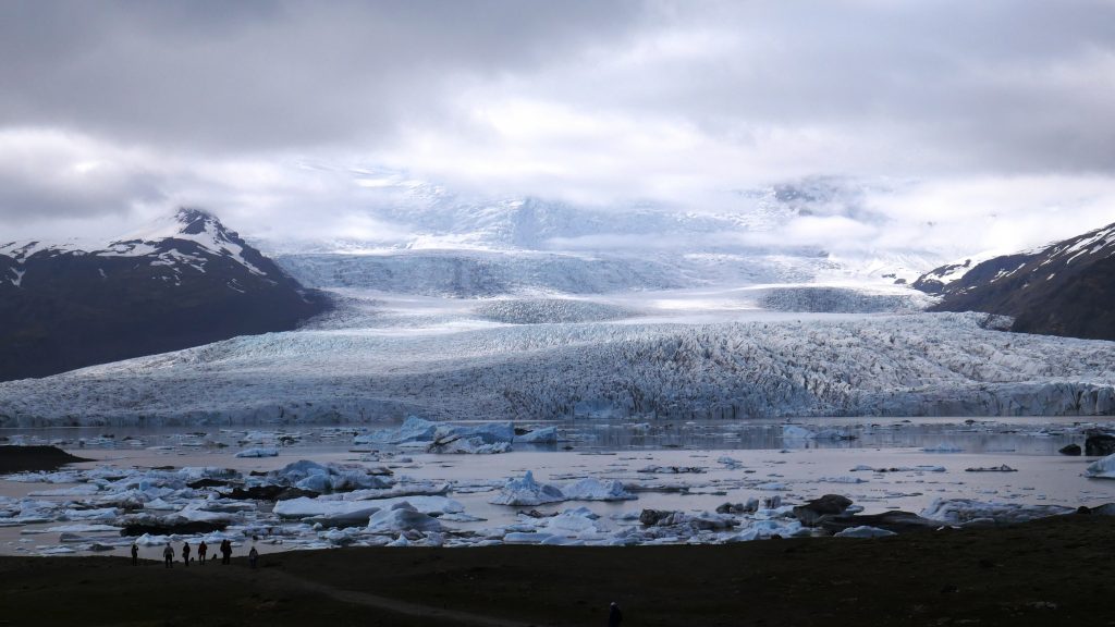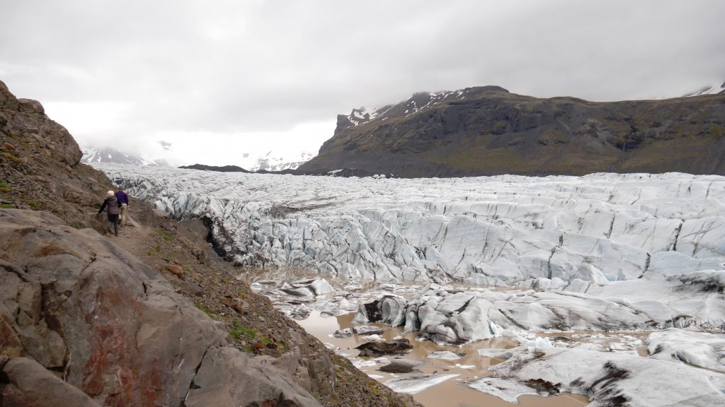 Aber nun fix zum ersten Gletscher, den Svinafellsjökull ‚Schweinefelsengletscher‘. Wie immer haben wir uns mit diesem Gletscher den weniger touristisch erschlossenen Gletscher ausgesucht. Das heißt für uns und unseren ‚Kleinst’wagen, dass wir 2 km über eine Schotterpiste fahren mussten und schon befürchteten, dass wir auf dem Rückweg die Federn oder gar gleich die ganze Achse austauschen müssten. Aber Picanto hat es überstanden und wir mit leichten Rückenschmerzen auch 🙂 Dafür überraschte uns am Ende des Weges ein riesiger Gletscher am Fuße des höchsten Bergs Islands (2110 Meter), welcher sich jedoch hinter Wolken zum größten Teilen versteckte.