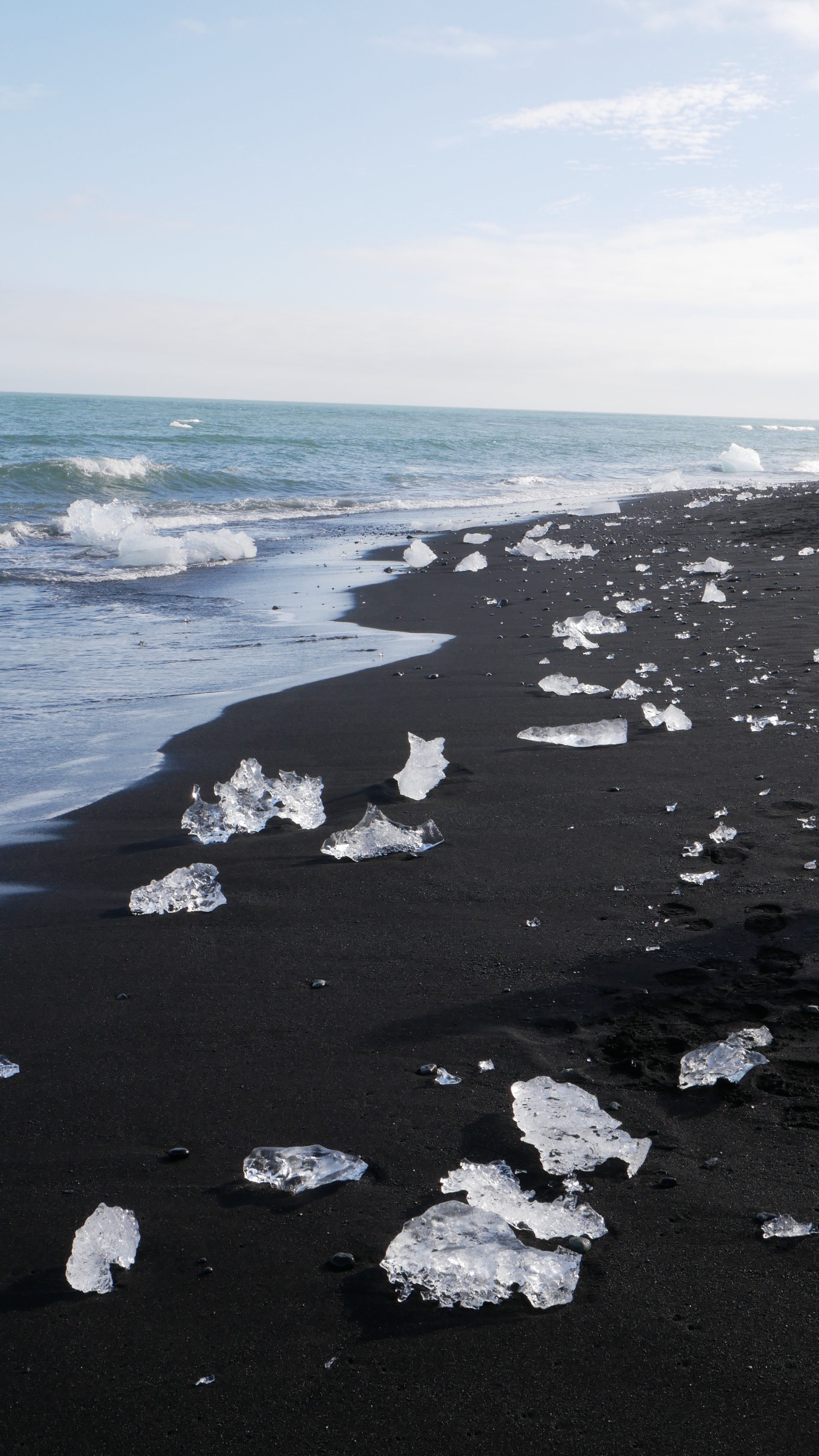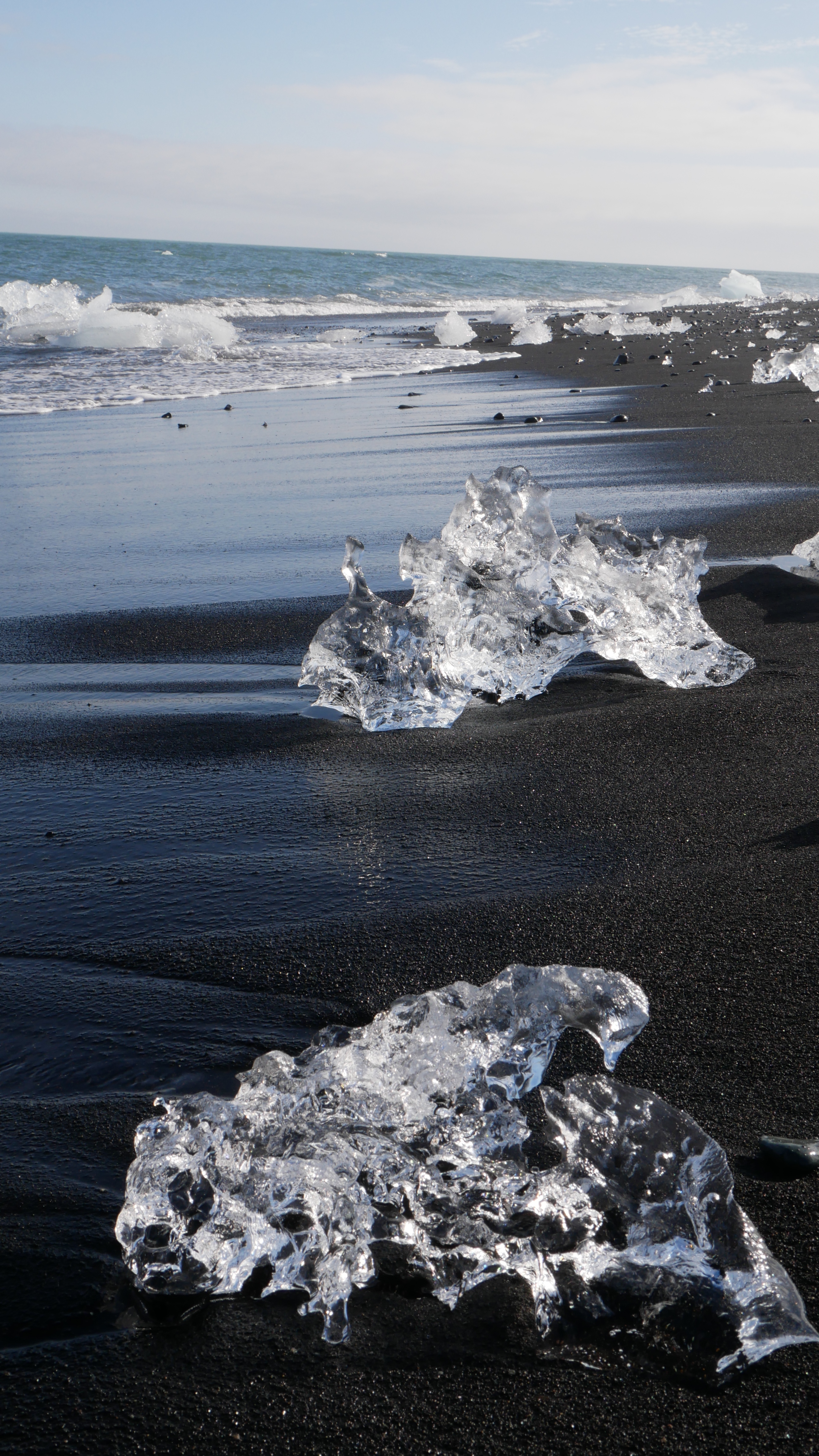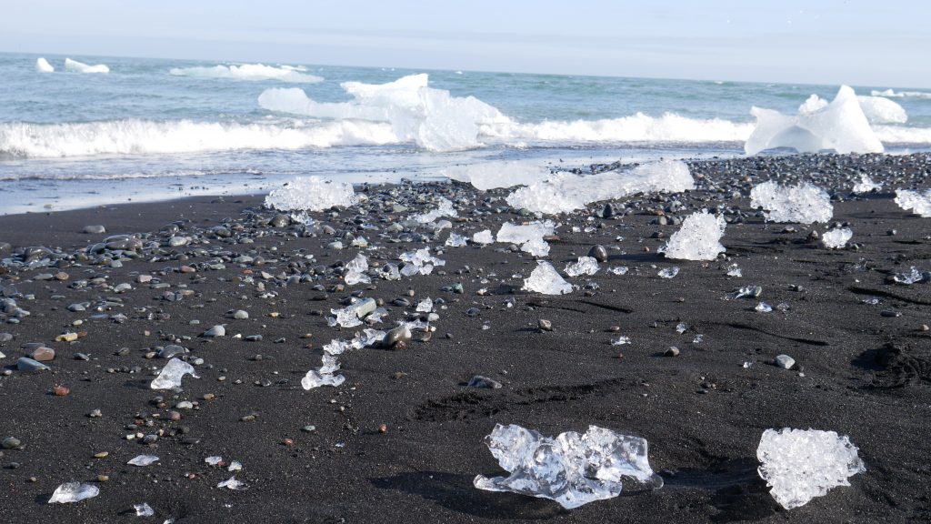 Es lässt sich nicht in Worte fassen, wie es donnert wenn Eisschollen dieser Größe brechen, gegen andere Schollen rammen und auf der Strömung ins Meer getragen werden. Wie auf dem Jahrmarkt staunten wir und die Menschen um uns rum, wenn dies passierte. Zu Fuss ging es weiter zum Diamonds Beach. Als wir am Strand standen wussten wir, wie der Strand zu seinem Namen gekommen ist. Nicht der glitzernde Lavastrand war Namensgeber, sondern die zerbrochenen Eisschollen, die sich am Strand sammelten und auf dem schwarzen Untergrund wie Diamanten in der Sonne strahlten.