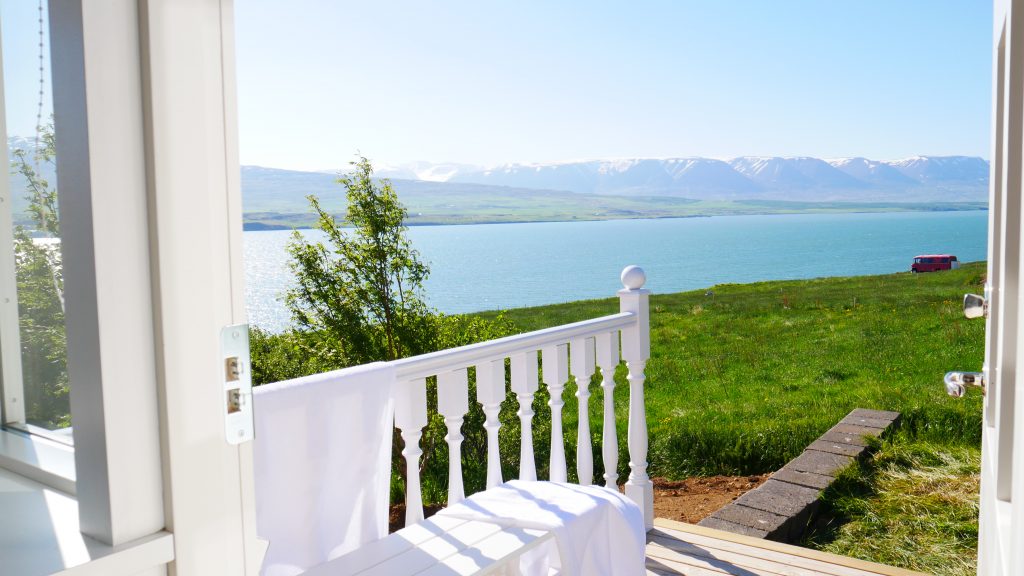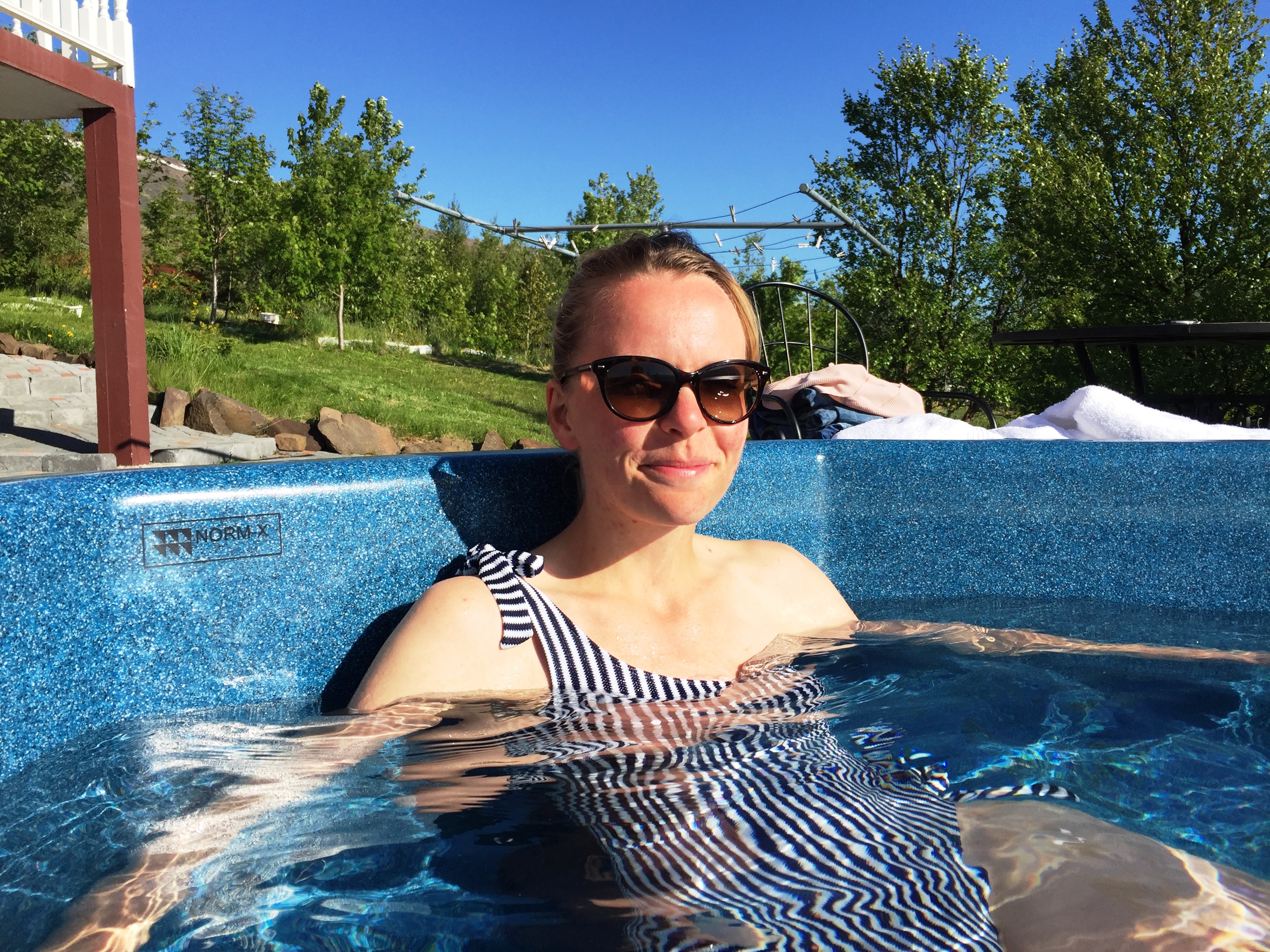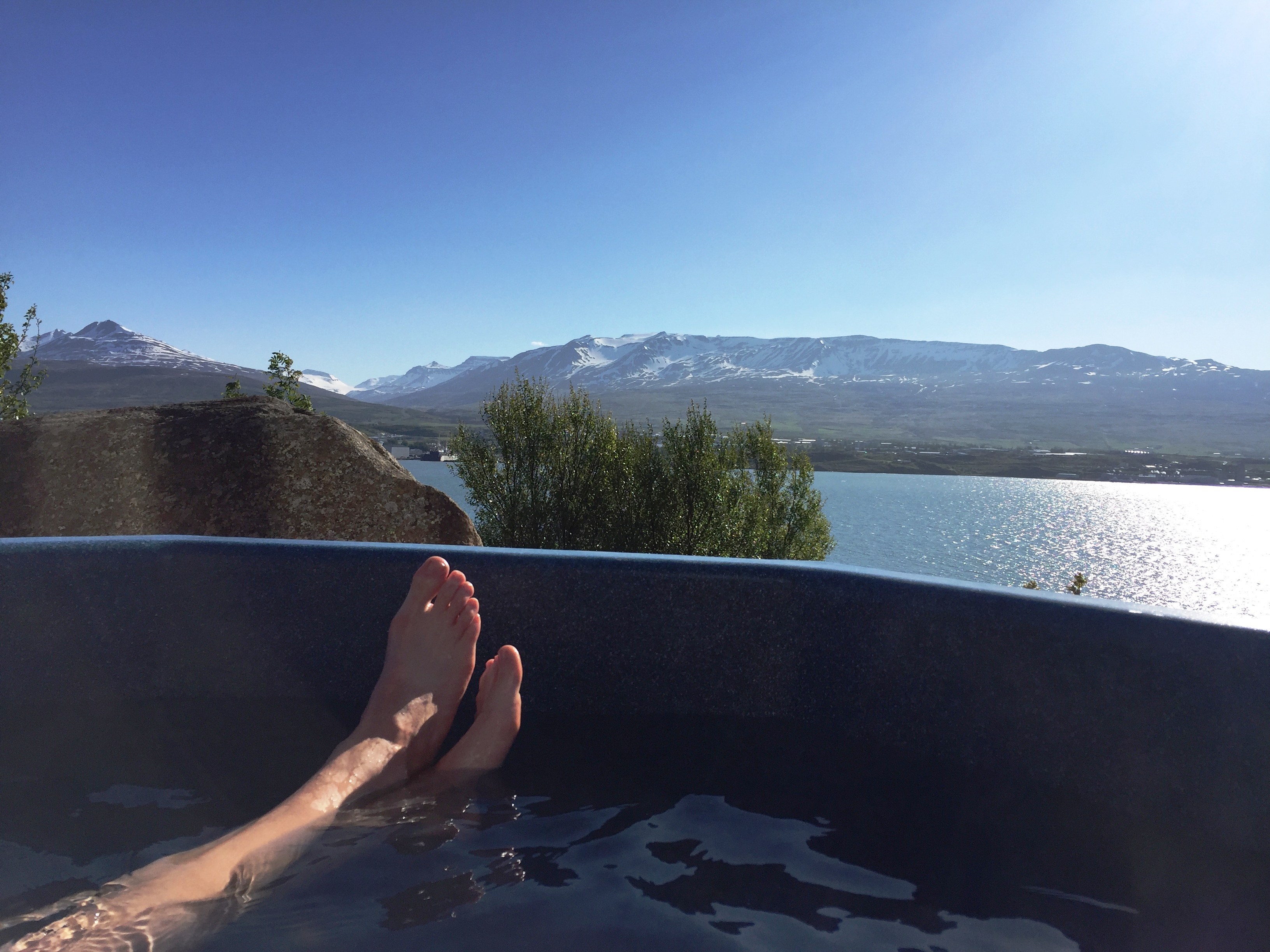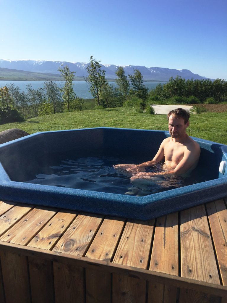 Auf der Rückfahrt merkten wir, dass wir schon wieder weit über 150km geschrubbt haben und wir gerade hier im ruhigen Norden einfach mal einen Gang zurückschalten sollten. Wir suchten uns den besten Ausblick und machten es uns gemütlich. Erst schauten wir noch mit einem Auge übers Wasser nach Walen, dann schlummerten wir eine Runde. Zurück in der Unterkunft perfektionierten wir die Entspannung: Unsere Gastgeber ließen uns den Hot Pot mit warmen Thermalwasser voll und wir genossen den herausragenden Blick die Abendsonne über unserem Fjord.