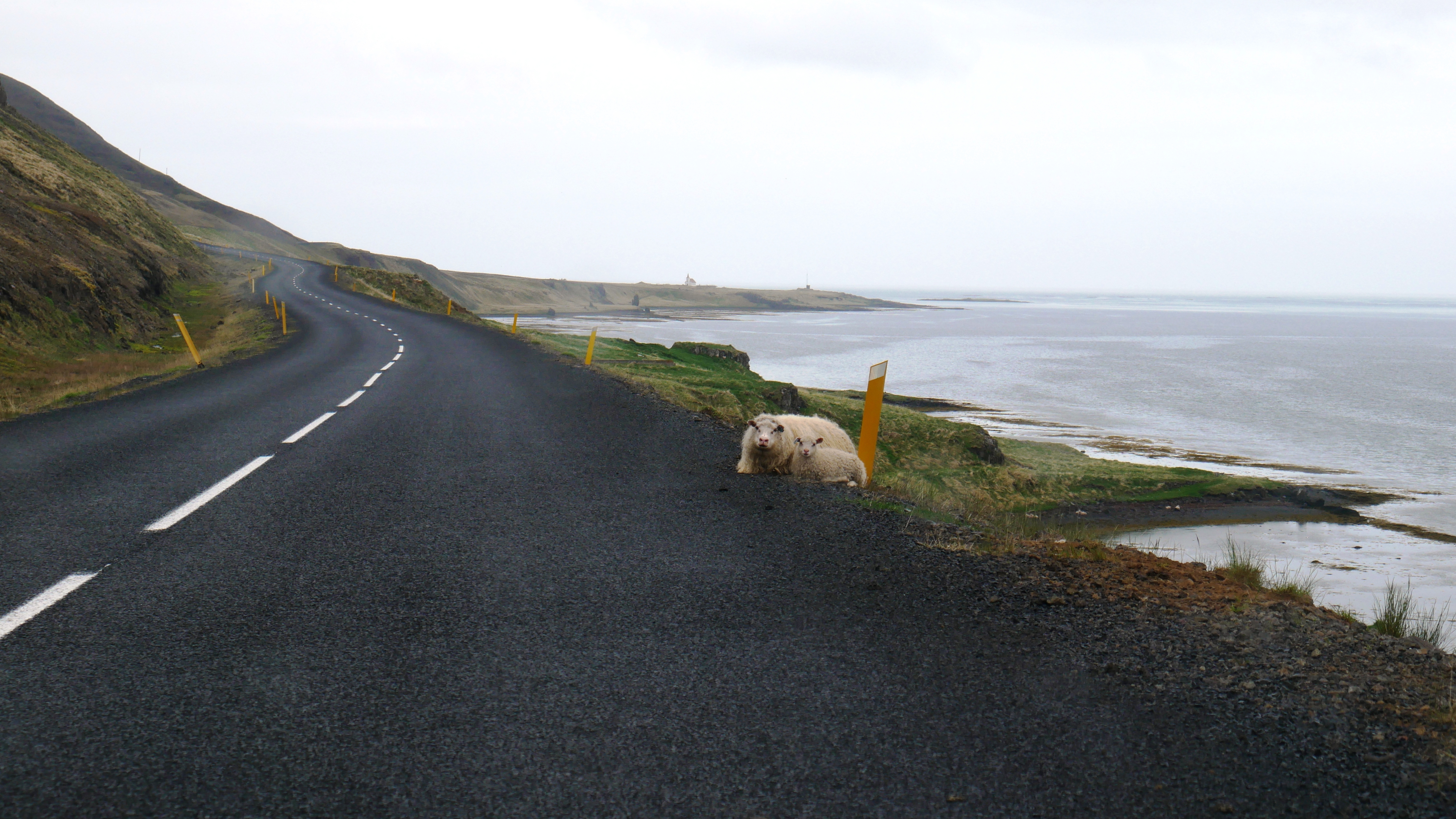 Heute gibt es wirklich nicht viel zu berichten, wir sind lange, lange durch Pampa gefahren. Wir realisierten, dass wir ziemlich weit von der Ringstraße weg nach Norden fuhren, wo ziemlich wenig los ist und aktuell schlechtes Wetter war. Die Kombination gefiel uns nicht so. Wir überlegten kurz, ob wir die Unterkunft nicht doch auslassen und weiter Richtung Reykjavik weiterfahren, um dort mehr Zeit zu haben. Aber wir dachten g’zahlt isch g’zahlt und wir fuhren weiter ins Niemandsland. Die Straßenverhältnisse wechselten zwischen Schotterpiste und Asphaltstraße mit ungläubig glotzenden Schafen am Wegesrand.